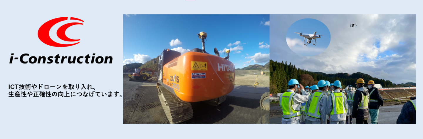 ICT(i-Construction)やドローンを導入し、生産性・正確性のさらなる向上を目指して作業しています。