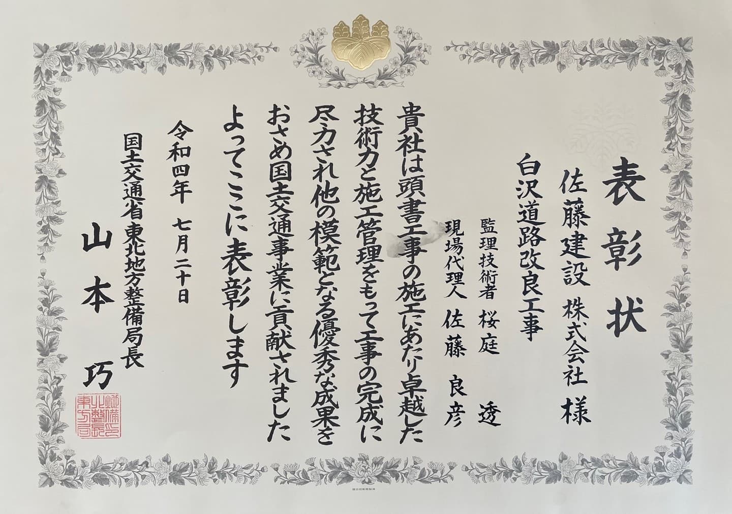 2022年 国土交通省 東北地方整備局 令和4年度優良工事表彰 白沢道路改良工事