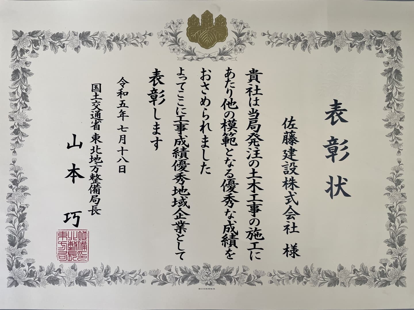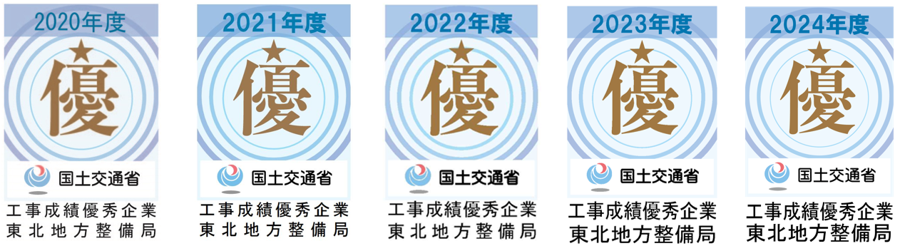 - 2023年 国土交通省 東北地方整備局 令和5年度 工事成績優秀地域企業受賞
