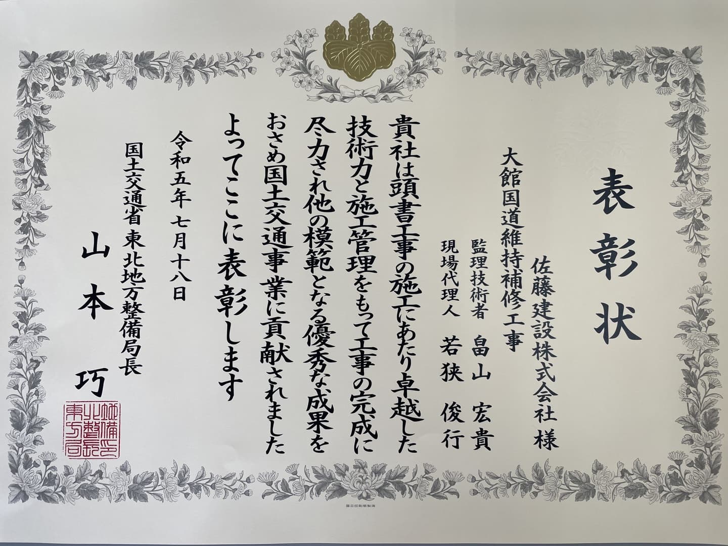 - 2023年 国土交通省 東北地方整備局 令和5年度 優良工事表彰 大館国道維持補修工事