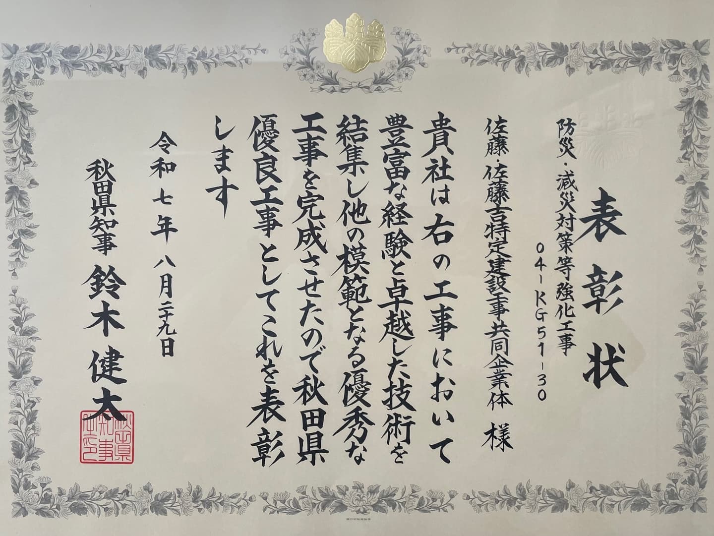 - 2025年 第46回秋田県優良工事表彰 防災・減災対策等強化工事